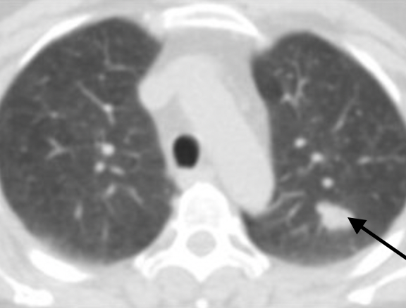 Exemple: la tumeur se situe dans le lobe supérieur gauche : au vu de la taille de la lésion, la chirurgie pourra se faire sous vidéothorascopie et consistera en une lobectomie supérieure gauche avec curage ganglionnaire